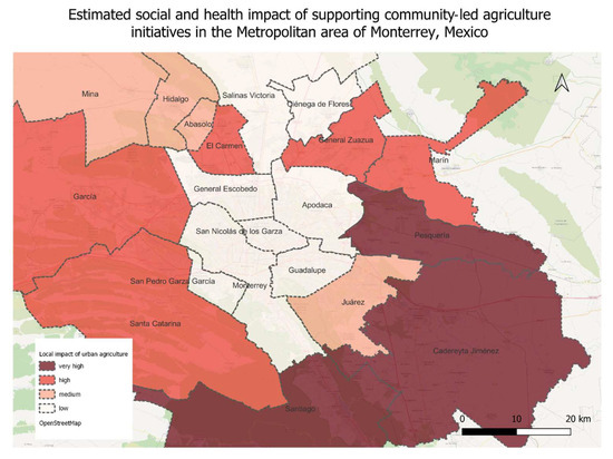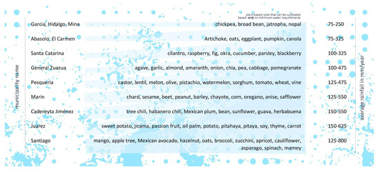 Considering the previous analysis of the suitability of urban/periurban agriculture and the socioeconomic indicators, we estimated areas where urban/periurban agriculture could have most health and social impact (Table 5 and Figure 5). We found that the promotion and support of the local production of plant-based foods in the municipalities of Pesquería and Caderayta Jiménez could have the highest impact, since the suitability for such activities in terms of open arable land and the percent of people who live in poverty in these food environments are high. The impact could be especially significant in Pesquería since it is currently a food desert. The planning should support the urban agriculture initiatives by improving accessibility in Pesquería. Supporting urban/periurban agriculture in the other food deserts could also have a significant impact, especially in El Carmen and García, which have populations with the highest poverty index but also very fertile soils. These two municipalities are close to the IMSS clinic that reported the highest rise in diet-related diseases, thus urban agriculture there could improve fairness and equity in food access and health. Nevertheless, the agricultural strategies in El Carmen and García should be oriented to dry farming and the harvesting of water to promote better outcomes. On the other hand, farming in San Nicolás de los Garzas, which uses soil-enriching techniques, could promote the improvement of urban health in the zone where high rates of diet-related diseases are found. Santiago and Santa Catarina—dense and impoverished food swamps—should prioritize the support of plant-based local food production since the conditions are conducive to urban farming in these zones. Planning in Santiago should focus on improving access so that urban agriculture can have more impact through better food distribution. Unfortunately, urban/periurban agriculture in the densest municipalities such as Apodaca and Monterrey is not possible due to infertile soils and a lack of unbuilt areas, thus the promotion of such efforts there could have low social impacts unless they are focused on vertical farming and hydroponics. In Figure 6, we present a list of plant-based foods that could be promoted for urban agriculture in each municipality based on minimum water requirements for their cultivation and natural conditions. for the high impact zones that could serve as a guideline for future planning to increase plant-based diets.
