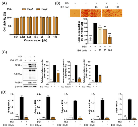 Firstly, we observed the cell viability after treating the cells with various concentrations of IEG (3.125–100 μM) to determine the treatment concentration of IEG. No change in cell viability was observed at any concentration of IEG after 24 and 48 h (Figure 1A). Therefore, we selected three high concentrations (25, 50, and 100 μM) and examined the effects of IEG during the differentiation process of 3T3-L1 cells. According to ORO images and quantified values, MDI effectively induced 3T3-L1 differentiation into adipocytes, resulting in a 75% increase in lipid accumulation compared to 3T3-L1 preadipocytes (Figure 1B). In contrast, IEG decreased the accumulation of lipid droplets in a dose-dependent manner, with reductions quantified at 79, 70, and 32% for doses of 25, 50, and 100 μM, respectively. The protein expression levels of mature adipocyte transcription factors including PPARγ, C/EBPα, and FABP4 were significantly reduced by IEG at 100 μM, which had the highest inhibitory efficacy in lipid accumulation (Figure 1C). Furthermore, the mRNA expression levels of adipogenesis-related genes, including Pparg, Cebpa, Fabp4, and Adipoq, as well as the lipogenic gene Fasn were suppressed by IEG (Figure 1D). Thus, IEG suppressed adipogenesis in 3T3-L1 cells.