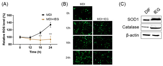Inhibitory effect of intracellular reactive oxygen species (ROS) generation by IEG during the MCE in adipocyte differentiation. (A,B) Quantitative values (A) and representative fluorescence images (B) of changes in intracellular ROS levels over time after treatment with MDI and IEG (100 μM). (C) Protein expression of ROS antioxidant enzymes, SOD1, and catalase at day 8. *** p < 0.001 compared to the MDI-only-treated group at the same time point.