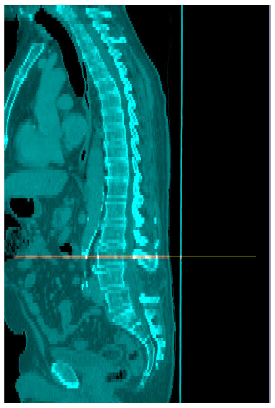 Identification of the mid-point of L3 on sagittal CT images (orange line).