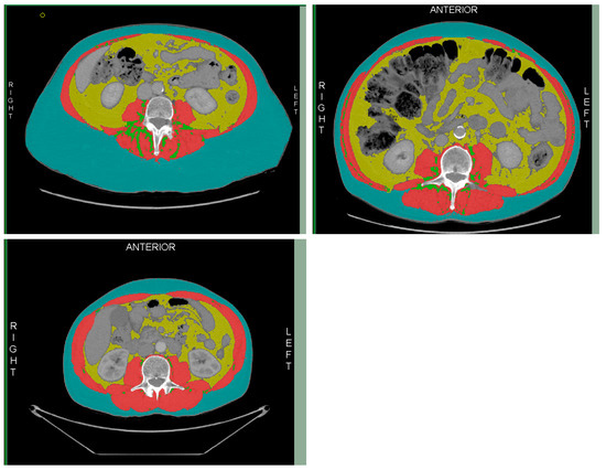 Two operators carried out repeated analysis on a set of ten images until their results were reproducible to <3% error. Screenshots were taken at each step of the process, and these were assessed by a third operator for accurate selection of the L3 image (Figure 1) and completion of the assessment of skeletal muscle (SM), visceral adipose tissue (VAT), subcutaneous adipose tissue (SAT), and intramuscular adipose tissue (IAT) (Figure 2).