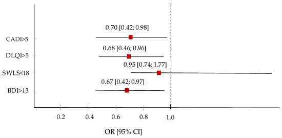 Acne vulgaris is a serious social problem that most often affects young people and significantly reduces their quality of life. Therefore, identifying factors that can improve the QoL of people with AV is an important element of modern medicine [28]. It has been proven that only holistic patient care, taking into account physical and emotional aspects, can bring beneficial results [6]. In this study, AV had a moderate impact on the participants’ QoL, as measured by the CADI and DLQI questionnaires. Additionally, the respondents had an average satisfaction with their life as measured by the SWLS questionnaire. Moreover, almost one-third of the subjects showed depression, mostly mild, as measured by the BDI questionnaire. This study included young women aged 18–35, mainly with mild and moderate acne, for whom the condition of the skin is very important. Some authors have shown that in a group of young people, a greater reduction in QoL due to acne was associated with the severity of acne and the female gender [29].