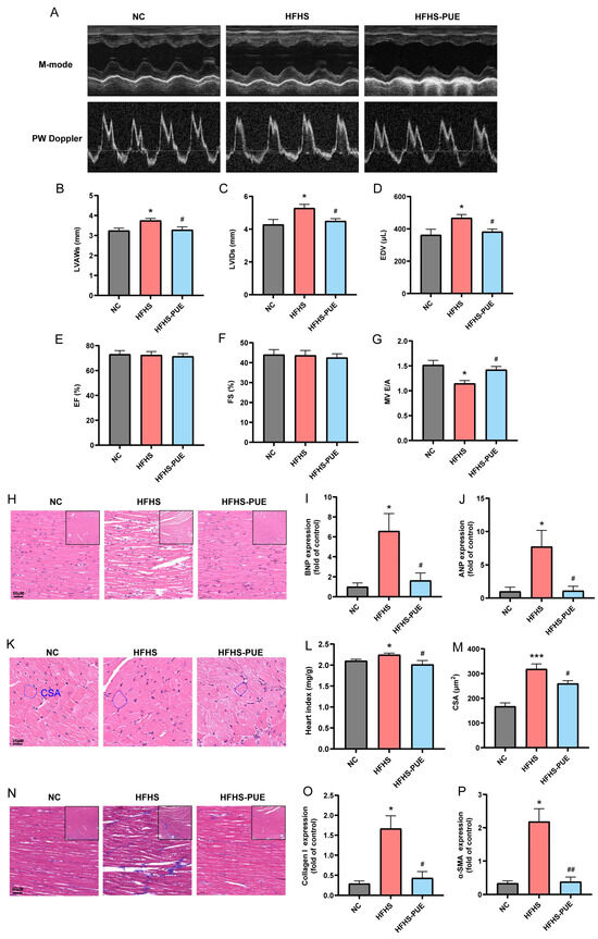 3.3. PUE Mitigated Cardiac Dysfunction and Structural Remodeling in HFHS Diet Rats