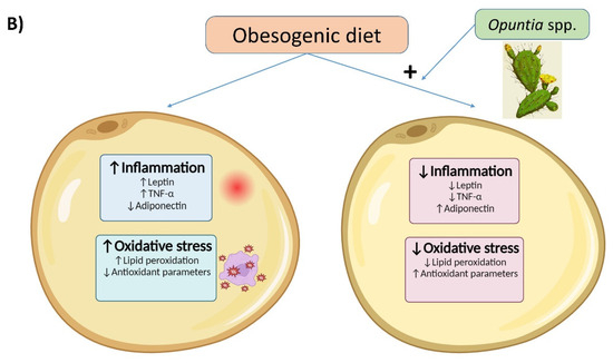 Moreover, the authors measured the gene expression of leptin and pro-inflammatory cytokines (IL-1β, IL-6 and TNF-α, but not IL-10) in adipose tissue, noting that it was higher in mice fed with the obesogenic diet. Interestingly, the infusion of Opuntia ficus-indica totally prevented this effect (p < 0.05). In the case of adiponectin, despite the decrease in its gene expression induced by the high-fat diet, the infusion was not able to significantly prevent this effect. In summary, the administration of Opuntia ficus-indica cladodes as an infusion exhibits a protective effect against obesity and inflammation induced by a high-fat diet.