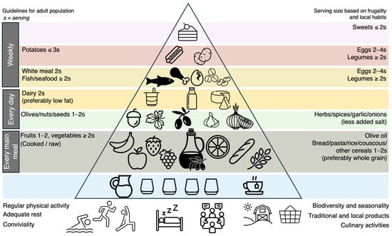 - Bach-Faig, A.; Berry, E.M.; Lairon, D.; Reguant, J.; Trichopoulou, A.; Dernini, S.; Medina, F.X.; Battino, M.; Belahsen, R.; Miranda, G.; et al. Mediterranean Diet Pyramid Today. Science and Cultural Updates. Public Health Nutr. 2011, 14, 2274–2284. [Google Scholar] [CrossRef]
