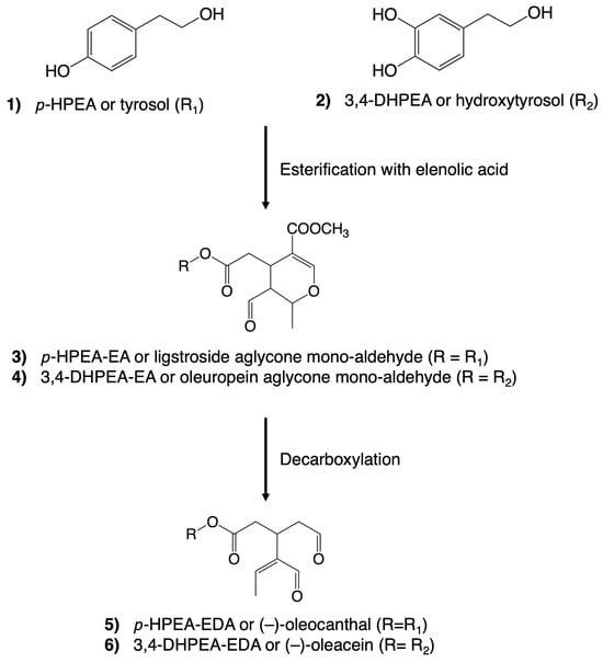 Remarkably, the alcoholic phenols, tyrosol and hydroxytyrosol, and the secoiridoids share close structural relationships (Figure 2). Tyrosol (p-hydroxyphenethyl ethanol, p-HPEA (1)) and hydroxytyrosol (3,4-dihydroxyphenylethyl ethanol, 3,4-DHPEA (2)) can exist independently in VOO. However, upon esterification with elenolic acid, they undergo derivatization into secoiridoids. These compounds constitute a prominent and intricate family within the polar fraction of VOO. The most prevalent secoiridoids in VOO include the mono-aldehydic forms of ligstroside aglycones (p-HPEA-EA (3)) and oleuropein (3,4-DHPEA-EA (4)), as well as the di-aldehydic forms of their decarboxymethylated derivatives, (-)–oleocanthal (p-HPEA-EDA (5)) and (-)–oleacein (3,4-DHPEA-EDA (6)) [40].