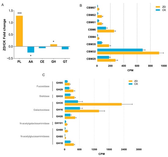 3.5. CAZy Functional Profiles of the Gut Microbiome and Differential Functions between the ZD and CK Group