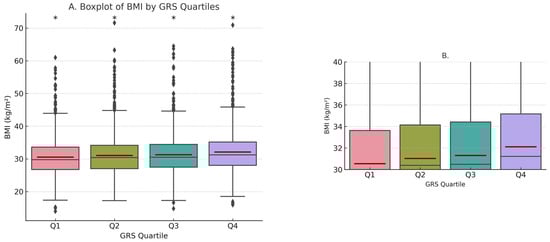 Boxplot of BMI across GRSBMI Quartiles. (A) Median and mean BMI within each GRSBMI quartile (Q1, Q2, Q3, Q4). Dark red line indicates the mean BMI. (B) Zoomed inset—enlarged view of mean and median BMI values for GRSBMI quartiles. * Significance at the level of α < 0.001.