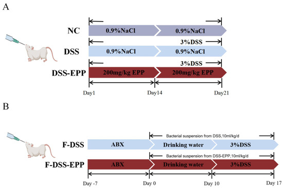 Experimental flow chart of animal treatments. (A) Flow chart of colitis model and EPP treatment. (B) Flow chart of fecal microbial transplantation.