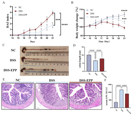 The methodology is illustrated in Figure 1A whereby mice from the DSS group and DSS-EPP group had 3% (w/v) DSS added to their drinking water on days 14–21. The DAI score of the colitis model mice were significantly higher (p < 0.001) and their body weights were significantly lower (p < 0.0001) compared to those of the NC group, and the length of the colon was significantly shorter (p < 0.0001). In contrast, EPP treatment significantly attenuated DSS-induced colitis symptoms (Figure 2A–D). H&E staining revealed inflammatory cell infiltration, intestinal epithelial cell loss, disordered arrangement, and mucosal swelling in the colonic tissue of the DSS treatment group. Treatment with EPP alleviated the above-described effects (Figure 2E). In addition, the serum LPS concentration increased significantly after DSS treatment; EPP treatment could reduce the serum LPS concentration (Figure 2F). The above results suggest that EPP can alleviate the clinical symptoms of DSS-induced colitis.