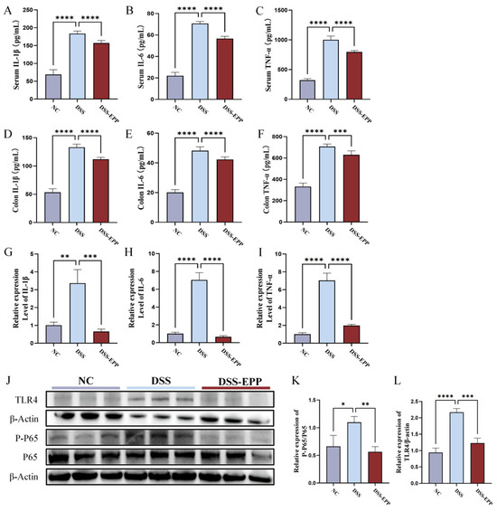 We evaluated the effects of EPP treatment on the DSS-induced proinflammatory response and oxidative damage. In comparison to those in the NC group, the serum and tissue levels of TNF-α, IL-β, and IL-6 in the DSS group were significantly increased (p < 0.0001). In the EPP group, this trend was significantly reversed (Figure 3A–F), and the change in the expression level of mRNA was consistent with these findings (Figure 3G–I). Western blotting revealed that the expression of TLR4 and the phosphorylation of the NF-κB protein in the DSS group were significantly increased compared to those in the NC group, and EPP pretreatment inhibited the activation of the TLR4-NF-κB pathway induced by DSS (Figure 3J–L). These results suggest that EPP intervention may alleviate colonic inflammation by inhibiting the TLR4-NF-κB pathway.
