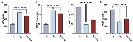 In comparison to the control group, the levels of MDA and MPO markedly increased in the DSS group (Figure 4A,B), with a significant decrease noted in SOD and T-AOC levels (Figure 4C,D). Notably, EPP therapy effectively prevented the decline in the tissue antioxidant index (p < 0.0001). In summary, EPP can alleviate DSS-induced oxidative stress in colon tissue.