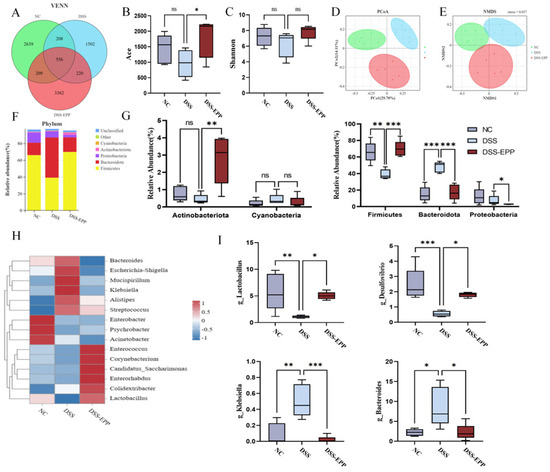 Echinacea purpurea polysaccharide (EPP) alleviated the disorder in the host intestinal microbiota. (A) The Venn diagram shows the OTUs that were detected in the NC, DSS, and DSS-EPP groups. (B,C) The Shannon and Ace indices indicate the α diversity. (D,E) The PCoA and NMDS methods were used to analyze the β diversity of the intestinal microbiota. (F) The composition of the intestinal microbiota at the phylum level was determined. (G) Differences in the abundance of the intestinal microbiota at the phylum level. (H) The heatmap shows the differentially abundant microbiota at the genus level. (I) The abundance of four intestinal microbiota (Bacteroides, Klebsiella, Lactobacillus, and Desulfovibrio). Data are presented as the mean ± SD (n = 5); ns, p > 0.05; * p < 0.05; ** p < 0.01, and *** p < 0.001.