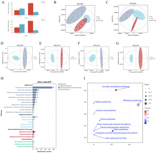 The effect of EPP on metabolic disorders. (A) Differentially abundant metabolites between NC and DSS, DSS and DSS-EPP were identified in two ionization modes (negative modes and positive modes). (B) The results of the PLS-DA analysis in each group in negative ion mode. (C) The results of the PLS-DA analysis in positive ion mode are shown. (D,E) The results of OPLS-DA between NC and DSS, DSS and DSS-EPP in anion mode, and (F,G) The OPLS-DA results in positive ion mode are shown. (H) The results of the KEGG enrichment analysis. (I) The results of the MetPA enrichment analysis are shown. (n = 7–8).