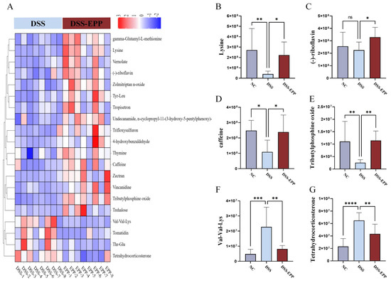 Differentially abundant metabolites. (A) The heatmap shows the top 20 metabolites with a fold change, and VIP value ≥ 1. (B–G) The abundances of 6 metabolites (lysine, (-)-riboflavin, caffeine, tributylphosphine oxide, Val-Val-Lys, and tetrahydrocorticosterone) in the NC, DSS, and DSS-EPP groups were determined. Data are presented as the mean ± SD (n = 7–8); ns, p > 0.05; * p < 0.05; ** p < 0.01; *** p < 0.001; and **** p < 0.0001.