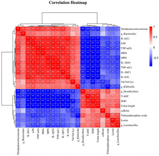 We used Spearman correlation analysis to assess the correlations between four representative bacteria, three metabolites, and physiological and biochemical indices. As shown in Figure 9, Bacteroides and Klebsiella were positively correlated with MPO and MDA levels and with tissue and serum proinflammatory factors and negatively correlated with the expression of antioxidant factors, colon length, and two representative metabolites, lysine and caffeine. Lactobacillus and Desulfovibrio were positively correlated with antioxidant factors, lysine and caffeine metabolites, and colon length but negatively correlated with proinflammatory factors, pro-oxidative stress indices, and the two metabolites Val-Val-Lys and tetrahydrocorticosterone. The heatmap of the correlation analysis provides a basis for understanding the specific mechanism by which EPP alleviates colonic inflammation induced by DSS and reveals the positive and negative relationships among representative intestinal bacteria, metabolites, and the phenotypes of colonic inflammatory disease; these results provide a basis for future research.