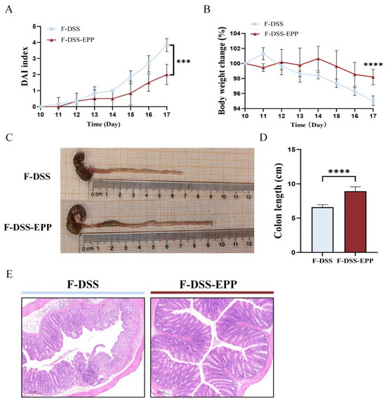 Protective effect of intestinal microbiota after EPP intervention on DSS-induced colitis. (A) DAI score during course of colitis. (B) Weight change curve during course of colitis. (C) Representative images of changes in colonic length of mice. (D) Statistical analysis of changes in colonic length in F-DSS and F-DSS-EPP groups. (E) H&E staining of F-DSS and F-DSS-EPP samples was performed. Data are presented as mean ± SD (n = 6); *** p < 0.001, and **** p < 0.0001.