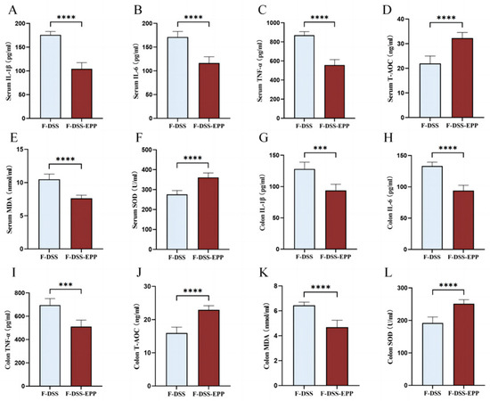 Serum and colonic tissue homogenate ELISA showed that the TNF-α, IL-1β, and IL-6 levels in the F-DSS-EPP group were significantly lower than those in the F-DSS group (Figure 11A–C,G–I), while the antioxidative indices T-AOC and SOD levels were significantly higher (p < 0.0001). The level of MDA was significantly lower (p < 0.0001) (Figure 11E,K). In summary, these results suggest that the EPP inhibition of inflammation and oxidative stress can be mediated through FMT.