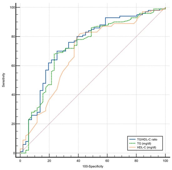 We also performed a ROC analysis to evaluate the ability of the TG/HDL-C ratio, serum TG levels, and serum HDL-C levels to detect MASLD specifically in women in the study population (Figure S1 and Table S1). Similar to the analyses performed in the whole study population, significant AUCs were found for the TG/HDL-C ratio, TG, and HDL-C in this subgroup (75.8% of the study population). However, no differences among the TG/HDL-C ratio, TG, and HDL-C levels were found in the AUCs of these parameters in women (p = 0.951 and p = 0.240 for comparisons between TG/HDL-C ratio and TG levels, and TG/HDL-C ratio and HDL-C levels, respectively).
