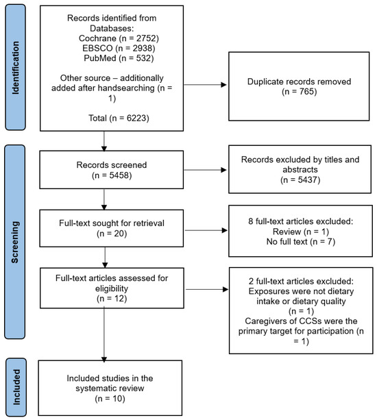 A comprehensive search was conducted for studies published between 1990 and July 2023 in PubMed, MEDLINE (via EBSCOhost), CINAHL (via EBSCOhost), Child Development & Adolescent Studies (via EBSCOhost), and Cochrane Library with no language restrictions. The reference list of all relevant articles and narrative reviews were also examined. The initial search strategy, available at https://www.crd.york.ac.uk/PROSPEROFILES/415079_STRATEGY_20240426.pdf (accessed on 26 April 2024), identified relevant keywords and subject heading searches (MeSH), including “childhood cancer survivors” (children, teenagers/adolescents, and young adult cancer survivors), “diet” (nutrition intake, diet quality), and “cardiovascular health” (cardiac events, cardiac dysfunction, and CVD risk factors). All searches were reiterated prior to the final analysis in July 2023 to ensure the inclusion of all eligible studies.