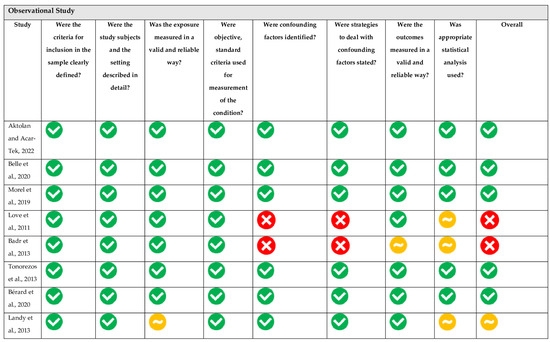 The risk of bias, using the JBI tool of each study, is summarised in Figure 2. In nine observational studies, two studies were assessed as “high” risk of bias, two “moderate” risk of bias, and five “low” risk of bias. The only interventional study was assessed as “high” risk of bias. The “high” ratings resulted from a lack of consideration for confounding factors. Meanwhile, the “moderate” ratings were mainly attributed to issues with statistical analysis in the “Some Concerns” section. Applying the GRADE methodology, the certainty levels of the outcomes were distributed as follows: three were categorised as “very low”, twelve as “low”, and two as “moderate” (File S4). Predominantly, the evidence was downgraded due to concerns regarding bias, imprecision, and inconsistency within the results.