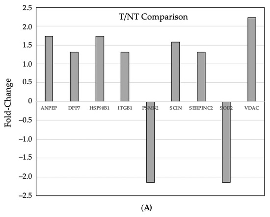 (A) Key differentially expressed (p ≤ 0.05) proteins in (A) tumor vs. adjacent non-tumor intestinal tissues from the adequate iron diet group and (B) tumor tissues from the excess vs. adequate iron diet groups. Proteins are presented by gene name. Fold-change expression differences are shown.