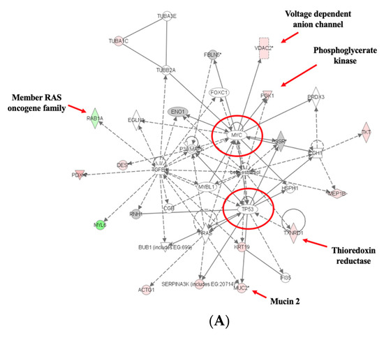 Ingenuity Pathways Analysis (IPA; Qiagen, Germantown, MD, USA) was performed to reveal biologically relevant protein expression/gene networks related to cancer (Pathway Studio 7, Ariadne Genomics, Rockville, MD, USA).