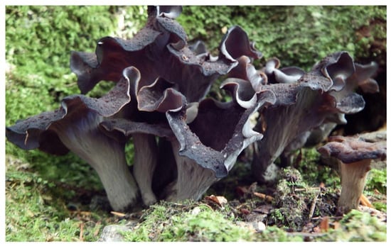 Black trumpet [Craterellus cornucopioides (L.) Pers], also called horn of plenty, black chanterelle, or trumpet of the dead, is a mushroom belonging to the phylum Basidiomycota, order Cantharellales. Its appearance is unusual for mushrooms: the mature fruiting body is very dark (dark brown to black) and has the shape of a slightly wrinkled, narrow funnel with a hollow center. The upper part of the fruiting body is rolled outwards (Figure 1). Fruiting bodies usually grow in scattered groups or clusters [2,3,4].