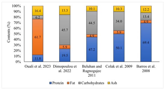 The ash content ranged from 10.1% to 17.4% dw [10,11,12,14,15,16,18] (Figure 2). Differences in the amount of minerals in mushrooms occur frequently and depend strongly on the composition of the soil (the differences can be huge). Dimopolou et al. [15] showed that the fruiting bodies of C. cornucopioides contained 4.7% dw fibers and 0.1% dw salt. The share of crude fiber in the fruiting bodies examined by Odoh et al. [14] was as much as 16.1% dw.
