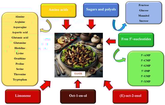 Chemical ingredients affecting the taste of food products containing black trumpet fruiting bodies (data sources: [10,12,13,16,17,40,42,43,44]; the figure was prepared by the authors, and the picture was generated using artificial intelligence in Bing AI).