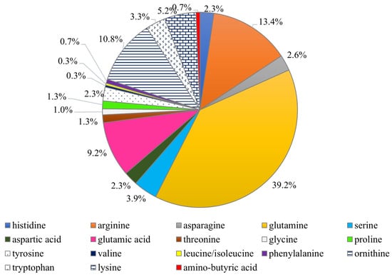The percentage of free amino acids present in the fruiting bodies of Craterellus cornucopioides (data from: Dospatliev et al. [40]).