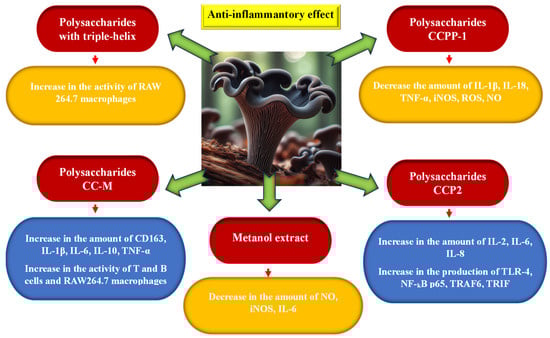 Anti-inflammatory activity of Craterellus cornucopioides fruiting bodies (data sources: [21,22,57,59,60,61,62,63,64]; the figure was prepared by the authors, and the picture was generated using artificial intelligence in Bing AI).