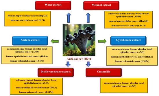 Anticancer activity of Craterellus cornucopioides fruiting bodies (data sources: [13,34,50,52,56]; the figure was prepared by the authors, and the picture was generated using artificial intelligence in Bing AI).