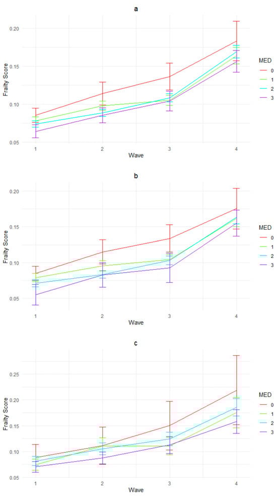 The findings found in Figure 2 and Table 2 reveal the complex relationship between diet and frailty outcomes. On the one hand, they indicate that, for the whole sample and for all subgroups, the frailty levels of older adults increased consistently over the four waves, regardless of their MED consumption levels. This reflected a well-documented trend observed in aging populations globally: with advancing age, individuals experience a gradual decline in physiological function and reserve capacity across multiple organ systems, and such cumulative effects of aging and decline in functional capacity is inevitable, contributing to the progression of frailty [1,49]. This has underscored the multifactorial nature of frailty, influenced by a combination of biological, social, and environmental factors, and indicated that dietary factors alone may not be sufficient to prevent or reverse the progression of frailty among older adults [50,51]. However, the general observation that higher MED consumption was associated with lower frailty levels also suggested a potential long-term protective effect of MED consumption against frailty among older adults [14].