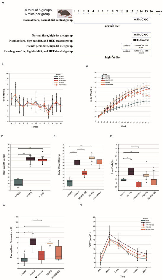Male 5-week-old SPF-grade C57BL/6/J mice were purchased from Vital River Laboratories located in Beijing, China. Mice were randomized into normal dietary control groups after the acclimatization period. After an acclimatization period, mice were randomly divided into a normal-flora control group (NFNDC, TP 23300, Trophic Animal Feed High-Tech Co., Ltd., Nantong, China. The composition of high-fat feed is shown in Table S1) and four high-fat diet model groups (NFHFD, normal flora model. NFHFDHEE, normal flora HEE. PGHFD, pseudo germ-free model. PGHFDHEE, pseudo germ-free HEE. 60% fat diet TP 23302, Trophic Animal Feed High-Tech Co., Ltd., China) of six mice each and fed for 16 weeks. The dose of HEE was set at 150 mg/kg, a dosage proven to have minimal side effects, thus selected as the optimal dose for the experiment. HEE was dissolved in 0.5% carboxymethyl cellulose (CMC; National Medicines Corporation Chemical Reagent Co., Ltd., Shanghai, China) to prepare the gavage solution. Two of the high-fat diet groups (PGHFD and PGHFDHEE groups) underwent antibiotic treatment for two weeks, during which the PGHFDHEE group and NFHFDHEE group were orally administered 150 mg/kg HEE daily for 4 consecutive weeks, following the antibiotic treatment. The other two groups of mice (NFHFD group and PGHFD group) and the NFNDC group received an equivalent dose of 0.5% CMC. Food consumption, body weight, and fasting blood glucose levels were measured weekly. At week 16, the mice were euthanized, and mouse feces were collected the day before. In a controlled environment, mouse blood was drawn under dim light conditions and allowed to clot for 60 min at 25 °C. The blood was then centrifuged at 3000× g for 10 min. Subsequently, the serum was separated and stored in a deep-freeze reservoir at a temperature of −80 °C for subsequent analyses. Liver and epididymal fat weights were recorded. Fecal and tissue samples were stored at −80 °C for further analysis. All animal experimental protocols in this study were reviewed by the Animal Ethics Committee and accurately implemented during use, and the entire experimental process was carried out with animal ethics in mind.