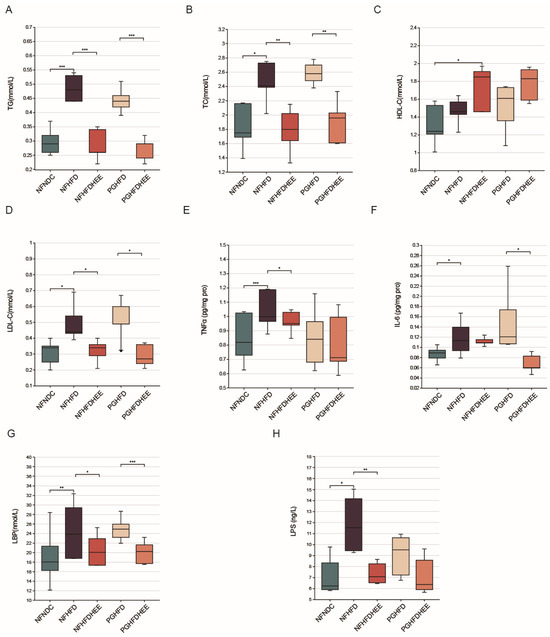 Systemic inflammation in NAFLD mice and the therapeutic effect of HEE were investigated by detecting cytokines in serum (Figure 3E–H). We observed that HEE effectively modulated the levels of tumor necrosis factors α (TNFα), endotoxin lipopolysaccharide (LPS), and lipopolysaccharide binding protein (LBP) in the NFHFDHEE group, while significantly alleviating the levels of LPS and interleukin-6 (IL-6) in the PGHFD group. Consequently, HEE has shown its beneficial effects by reducing the inflammatory response induced by a high-fat diet, thereby decreasing the liver’s susceptibility to the effects of endotoxins. This underscores HEE’s therapeutic potential in ameliorating diet-induced hepatic inflammation.