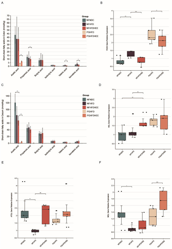 Figure 4. Regulation of short-chain fatty acids and hepatic lipid metabolism-related genes in the mouse intestine by HEE. (A) SCFAs in the colon. (B) FASN gene expression in liver. (C) SCFAs in the cecum. (D) HSL gene expression in liver. (E) ATGL gene expression in the liver. (F) MGL gene expression in the liver. Data are shown as mean ± SD. (For each group, n = 5, * p < 0.05; ** p < 0.01; *** p < 0.001). The black dots in the graph indicate the values detected for each sample.
