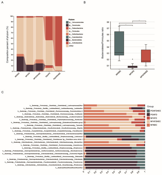 To investigate the modulatory effects of HEE on the gut microbiota of high-fat-diet-fed mice, we assessed changes in fecal microbial community structure after the administration of HEE using 16S rRNA analysis. The treatment notably adjusted the prevalence of Bacteroidetes and Firmicutes within the NFHFDHEE group, elevating Bacteroidetes quantities to similar levels as those observed in the control group, as illustrated in Figure 5A,B. This adjustment is further reflected by the Bacteroidetes-to-Firmicutes ratio. Among the antibiotic-treated cohort, Verrucomicrobia dominance was observed, which was marked by reduced microbial diversity and lower abundance.