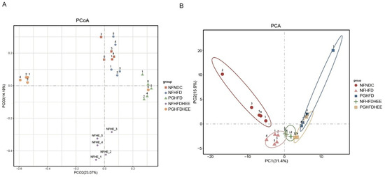 Figure 6. Modulation of intestinal species diversity in mice by HEE. (A) Principal co-ordinates analysis (PCoA) in the intestines of each group of mice. (B) PCA (principal component analysis) is applied in various groups of mouse intestines.