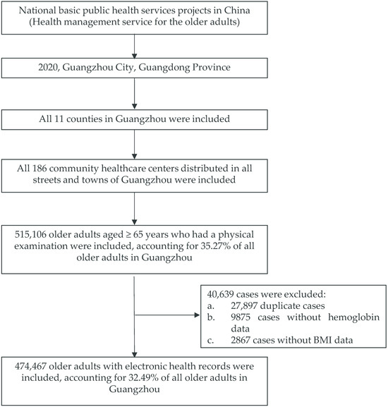 - Ni, W.; Yuan, X.; Sun, Y.; Zhang, H.; Zhang, Y.; Xu, J. Anaemia and associated factors among older adults in an urban district in China: A large-scale cross-sectional study. BMJ Open 2022, 12, e56100. [Google Scholar] [CrossRef] [PubMed]