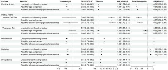 | Underweight | Meat or fish diet × Hypertension | −0.24 (−0.65, 0.11) | −0.36 (−1.18, 0.16) | 3.54 (−19.59, 18.78) | 0.75 (0.49, 1.16) |