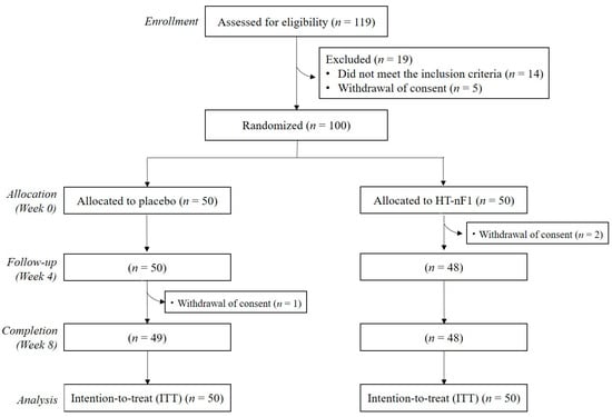 The study was designed as a randomized, placebo-controlled, double-blind trial. After conducting a screening test and obtaining written informed consent, a total of 100 subjects were randomly assigned to a placebo or HT-nF1 group for 8 weeks of treatment. Randomization was carried out using a computer-generated random list. The block randomization method was used, in which the control group and test group were assigned 1:1, and the allocation ratio of men and women in each group was nearly equal. Because this study was conducted in a double-blind fashion, the assigned group of subjects was not disclosed to the researchers or subjects until the end of the study. Subjects were advised to take one capsule daily with plenty of water. For 8 weeks, the placebo group (n = 50) took a placebo, and the HT-nF1 (n = 50) group took capsules containing 5 × 1011 cells nF1. Food intake, Pittsburgh Sleep Quality Index, Global Physical Activity Questionnaire, Global Assessment of Recent Stress Scale, and Fatigue Severity Scale were recorded at baseline, 4 weeks, and 8 weeks.