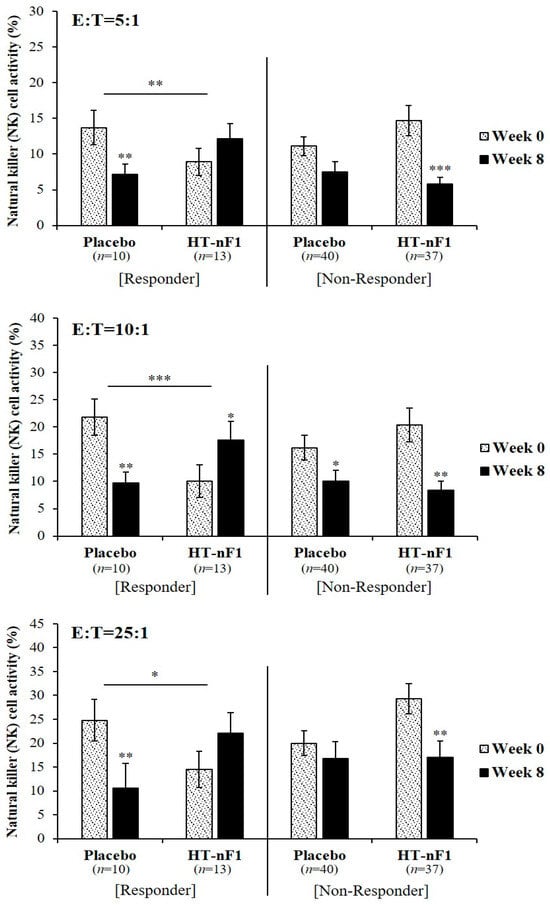 NK cell activity through stratified analysis according to sIgA in responders (≤49.61 μg/mL) and non-responders (>49.61 μg/mL) to HT-nF1. NK cell, natural killer cell; HT-nF1, heat-treated Lactiplantibacillus plantarum nF1; sIgA, secretory immunoglobulin A; E, effector cell; T, target cell. The estimate and p-value were from a linear mixed-effect model to compare the changes for 8 weeks between the groups. WBC at baseline and dietary fat intake for 8 weeks were adjusted. * p < 0.05; ** p < 0.01; *** p < 0.001.