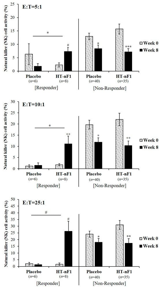The results based on NK cell activity (E:T = 10:1) (Figure 3) also indicated that in subjects with low NK cell activity (≤3.59%, responder) (placebo, n = 6; HT-nF1, n = 8), it has increased when HT-nF1 was consumed for 8 weeks. At E:T = 5:1 and 10:1 concentration ratios, the NK cell activity of the HT-nF1 group was 7.3 ± 1.5% and 11.1 ± 3.5%, respectively, which significantly increased by approximately 3.1- and 6.1-fold (E:T = 5:1, p = 0.083; E:T = 10:1, p = 0.003) after 8 weeks of treatment. At a ratio of E:T = 25:1, the NK cell activity of the placebo group decreased, but when HT-nF1 was consumed for 8 weeks, it increased approximately 15-fold to 26.2% ± 7.5% (p = 0.071). The change in NK cell activity when HT-nF1 was ingested for 8 weeks compared with the change in NK cell activity when the placebo was ingested for 8 weeks, a significant increase was observed for HT-nF1 at all ratios (E:T = 5:1, β = 12.2, p = 0.041; E:T = 10:1, β = 9.3, p = 0.037; E:T = 25:1, β = 17.9, p = 0.086). Consistently, subjects with high NK cell activity (>3.59%, non-responder) showed no significant change.