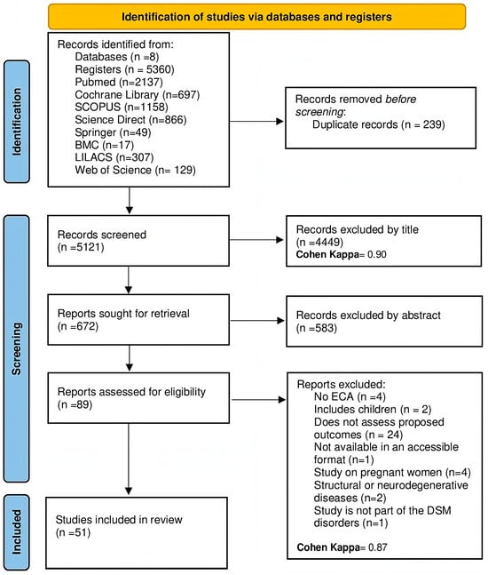 After searching the aforementioned databases, a total of 5360 potentially relevant articles were found. Following the removal of 239 texts due to duplication, 4449 articles were screened by title and an additional 583 were eliminated after abstract review. Out of the 89 research studies, 37 were excluded for the following reasons: (a) they were not randomized controlled trials (n = 4), (b) they involved underage patient populations (n = 2), (c) even though they measured changes in the intestinal microbiota or biomarkers, they did not evaluate outcomes previously established in the review (n = 24), (d) they were not available in accessible formats (n = 1), (e) the population consisted of pregnant women (n = 4), or (f) they evaluated patients with neurodegenerative or structural diseases such as Huntington’s or Parkinson’s (n = 2). A Cohen’s kappa of 0.96 for records excluded by title and abstract suggested a high level of agreement, indicating that the reviewers were almost in perfect accord about which records to exclude based on the initial screening. Similarly, a kappa of 0.87 for reports excluded after full-text assessment signified a substantial agreement, albeit slightly lower than for the initial screening, which was expected as decisions at this stage are often more complex and subjective. These results overall reflected a very high degree of reliability and consistency between the evaluators in the study selection process. Ultimately, 51 articles were included in this review. The details of the study selection are found in the PRISMA flowchart (see Figure 1).