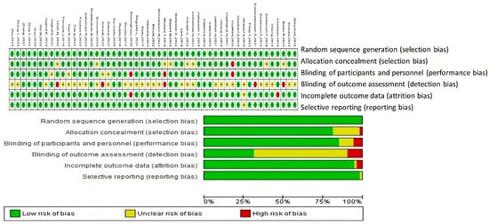 Regarding the blinding of participants and personnel (performance bias), the risk was mostly low, implying effective blinding of participants and study personnel to treatment allocations, thereby reducing the likelihood of performance bias. The blinding of outcome assessment (detection bias) also primarily presented a low risk, indicating that outcome assessors were probably unaware of the intervention groups, which minimizes detection bias.