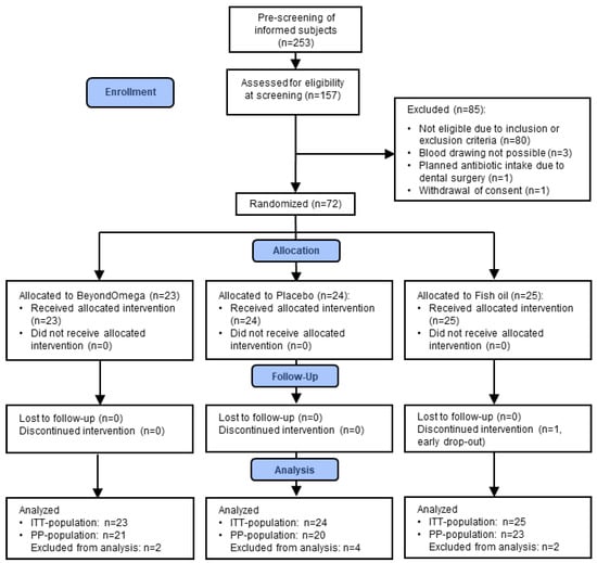 Between September 2022 and March 2023, 157 subjects were screened for their eligibility. Out of these, 85 were screening failures, and 72 (healthy males and females) were included in the study. Therefore, 72 subjects were considered for the intention-to-treat (ITT) population and 64 subjects for the per-protocol (PP) population (Figure 1). Data are presented for the ITT population. The main inclusion criteria were age between 30 and 75 years, a BMI of 19–35 kg/m2, and classification as an at-risk individual defined as at least slightly elevated advanced glycation end products (AGEs) and/or high sensitive C-reactive protein (hsCRP) level ≥ 1 mg/L. AGEs and hsCRP are commonly used biomarkers to assess oxidative stress and inflammation [26,27], which determine the risk and progression of various diseases, such as diabetes. Only nonsmokers were allowed to participate. As the plasma levels of several pro-resolving LMs usually correlate with the omega-3 index [28], only subjects with a cut-off level of omega-3 index ≤ 6.5% were enrolled in the study. To control for confounding factors, subjects were asked to refrain from fish consumption or other n-3 PUFA supplements or probiotics during the study intervention and also to avoid plant oils rich in n-3 PUFA. Furthermore, they were asked to maintain their food and lifestyle habits. Blood routine parameters were determined at the screening visit. Only volunteers with no clinically relevant abnormal findings and blood values within defined ranges were enrolled in the study. The clinical relevance of blood routine parameters outside the reference range was judged by the Investigator. The main exclusion criteria were as follows: