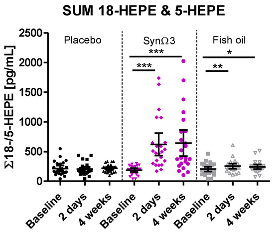 Plasma levels of the sum of 18-HEPE and 5-HEPE at baseline, after 2 days, and after 4 weeks of intervention; scatter diagram with mean ± 95% CI; * p < 0.05, ** p < 0.01, *** p < 0.001; significance derived from investigation of within-group changes and pairwise tests against baseline.