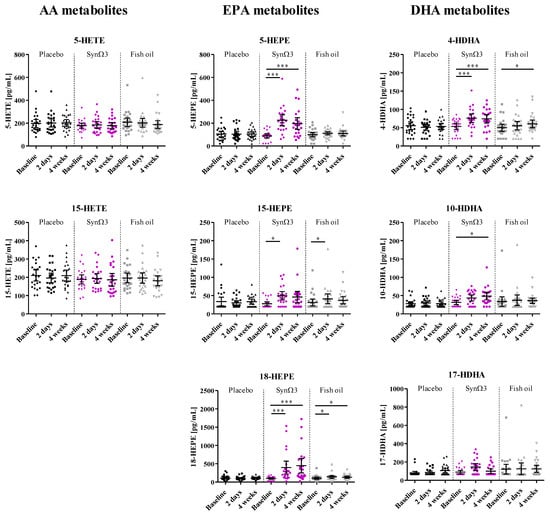 Plasma levels of individual lipid mediators at baseline, after 2 days, and after 4 weeks of intervention; scatter diagram with mean ± 95% CI; *** p < 0.001; * p < 0.05; significance derived from the investigation of within-group changes and pairwise tests against baseline.