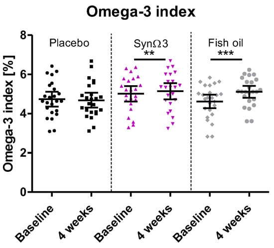 Distribution of omega-3 index (%) at baseline and after 4 weeks of intervention; scatter diagram with mean ± 95% CI; ** p < 0.01, *** p < 0.001; significance derived from investigation of within-group changes.